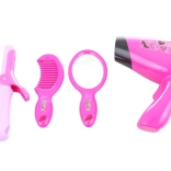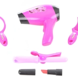 This pink beauty set gives children everything they need for their first hairdressing experiments. The hair dryer powered by 1× AA battery (not included) is complemented by a curling iron, comb, handheld mirror, and cosmetic accessories — all adapted for small children's hands.