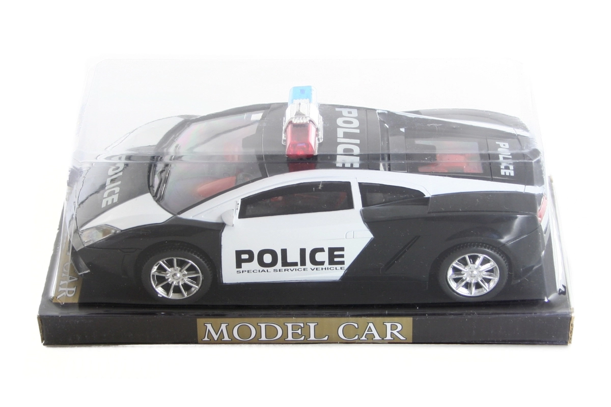 Police car with a flywheel mechanism. Car dimensions approx. 22 x 9 x 7 cm. Package dimensions approx. 26 x 13 x 10 cm. Age 3+
