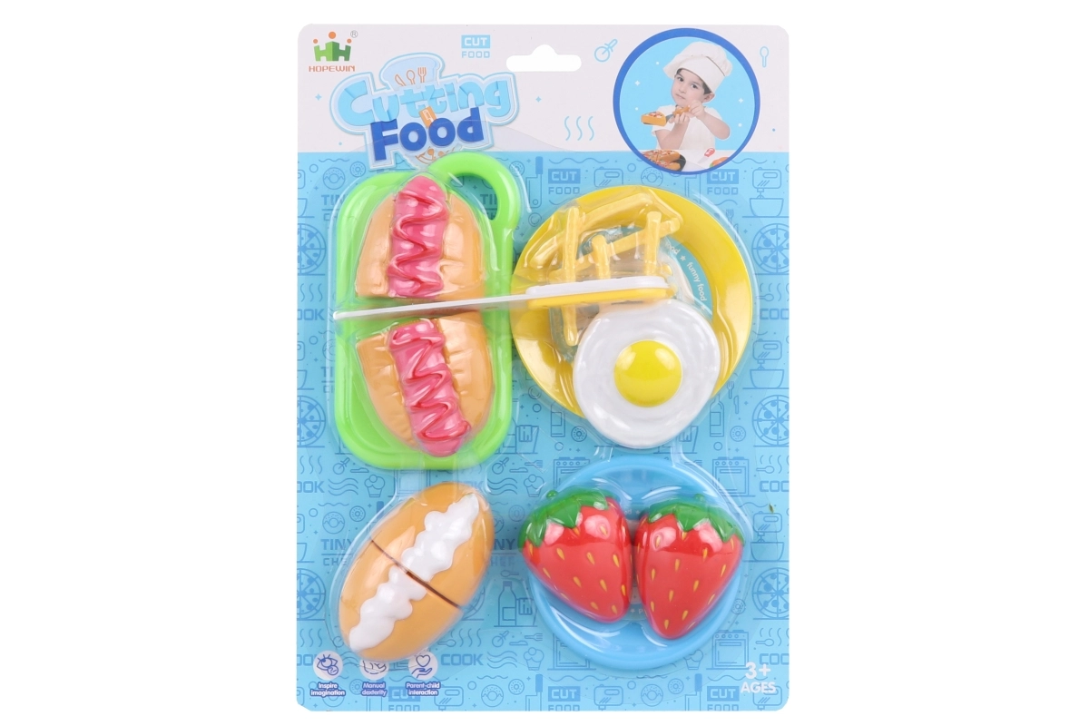 A fun food cutting set for little chefs that develops fine motor skills and coordination. It includes various types of food and utensils connected with hook-and-loop fasteners for repeated cutting and assembling. An ideal toy for children aged 3 and up.
