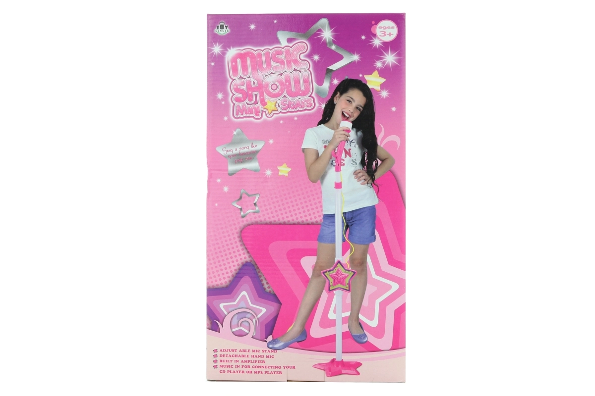 Kick off home concerts with this fun microphone for little singers. It includes a stable stand and the option to connect to an MP3 player to play favorite songs. Powered by 3× AA batteries (not included). Suitable for children ages 3+.