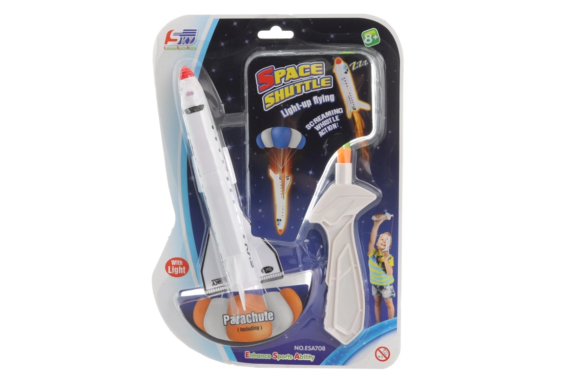 Launchable space shuttle with light. The rocket whistles and lights up during flight. Powered by 2 button cell batteries (AG3) – included in the package. Rocket size approx. 20.5 cm. Package dimensions approx. 29.5 x 21 x 5 cm. Age 8+