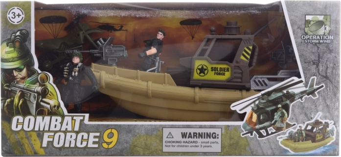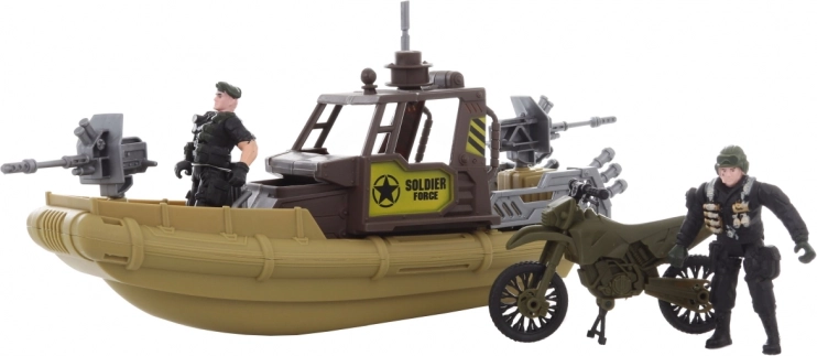 - Complete equipment – large boat, motorcycle, and 2 soldier figures.