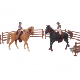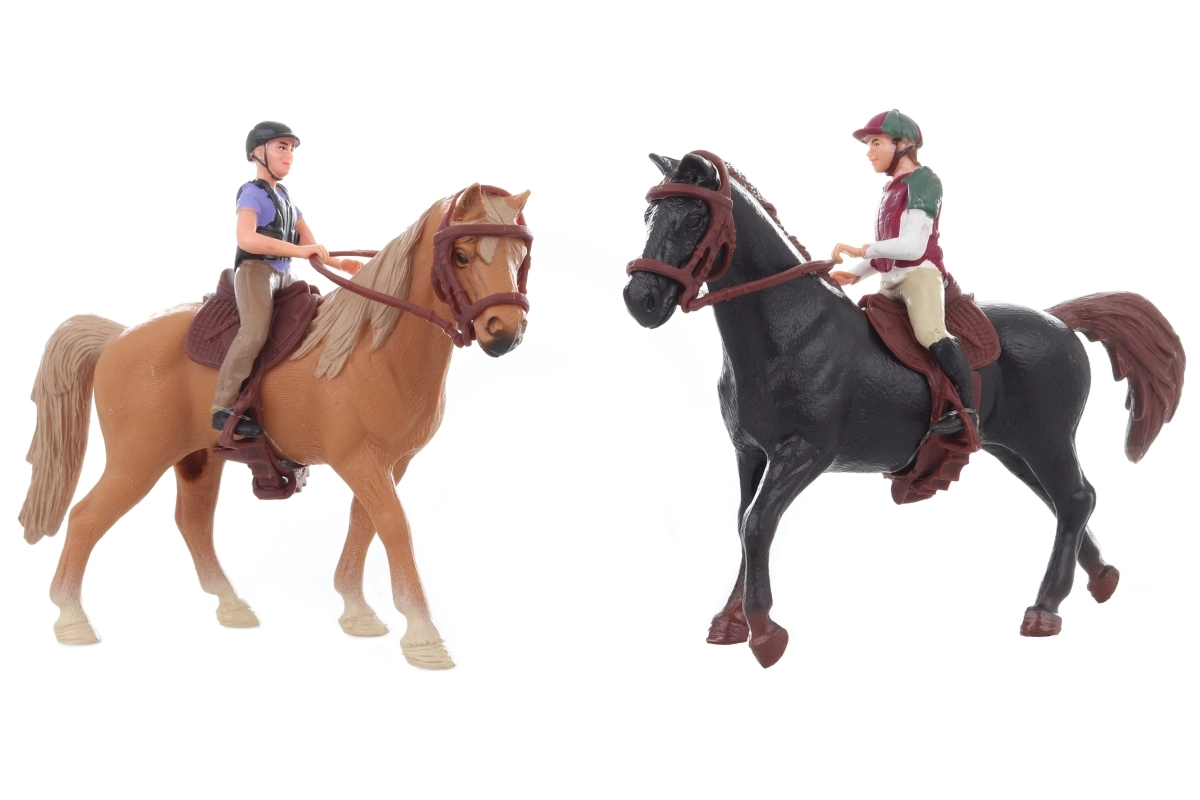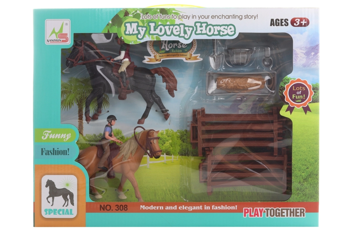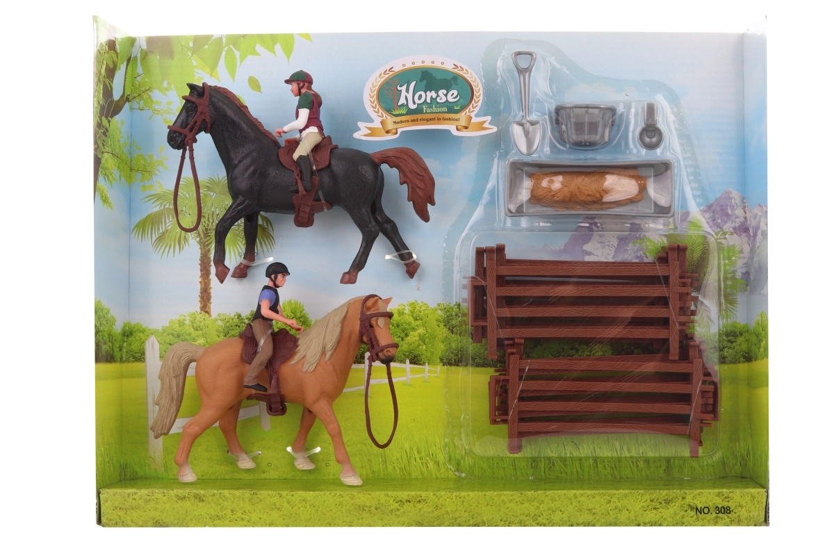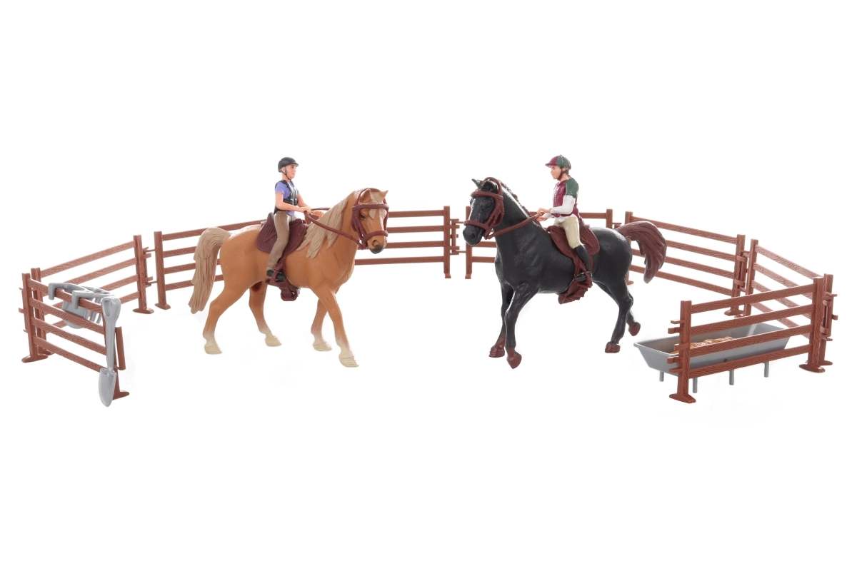 - Complete set – 2 horses, 2 riders, a paddock, and additional accessories.
