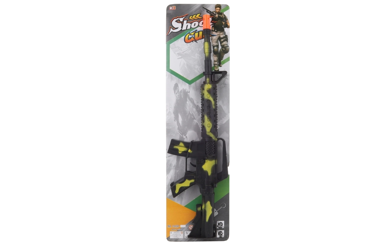 The camouflage plastic submachine gun is an ideal toy for action play at home or outdoors. Thanks to the mechanical sound effect, no power is needed, so kids can play anytime, anywhere. Its lightweight construction and compact dimensions make it easy to hold and play with for longer.
