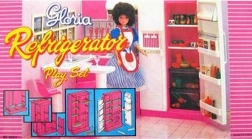 The Gloria fridge is designed with realistic details in a white-pink color scheme, mimicking a real appliance, and includes various compartments for play function.