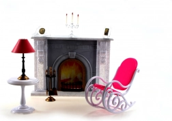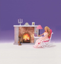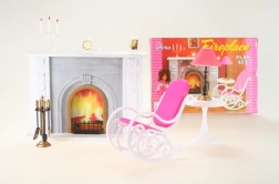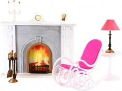 The package includes a rocking chair for comfortable seating, a side table with a decorative (non-working) lamp, and a stand with fireplace tools. Decorations such as a candlestick, picture, and clock complete the cozy atmosphere. Thanks to its plastic design, the set is lightweight, easy to maintain, and safe for children.