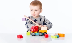 The toy supports the development of sensory-motor skills and creativity through the manipulation and stacking of blocks.