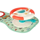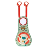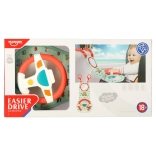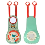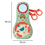 This interactive car steering wheel, designed to entertain your child during travel, includes a colorful panel with a steering wheel and a safe mirror. It contains four buttons and a sensory lever offering sounds and colorful lights to inspire children's imagination and sensory experiences.