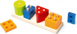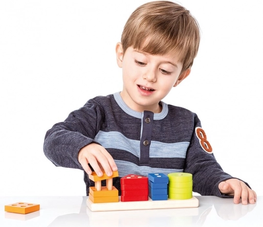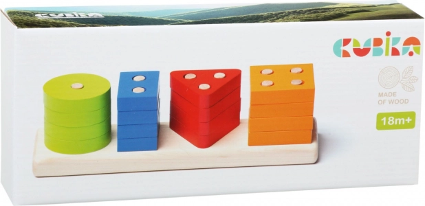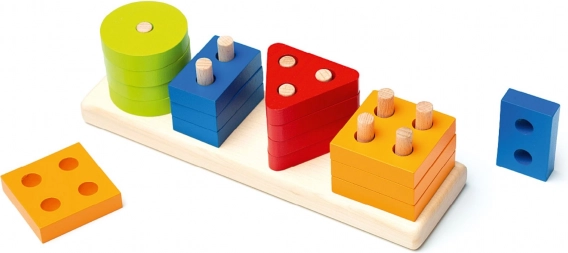 This high-quality wooden puzzle offers 16 colorful geometric shapes that are threaded onto pegs on a rectangular base. While playing, children learn to recognize colors and shapes, try different combinations, and naturally practice coordination and patience.