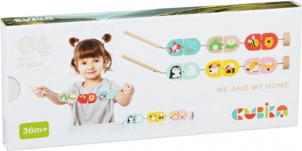 The Cubika “Where We Live” wooden set combines learning and fun. Children find the correct pairs—an animal and its home—and thread them onto a lace, naturally training fine motor skills and logical thinking. The pieces are colorful, sturdy, and pleasant to the touch.