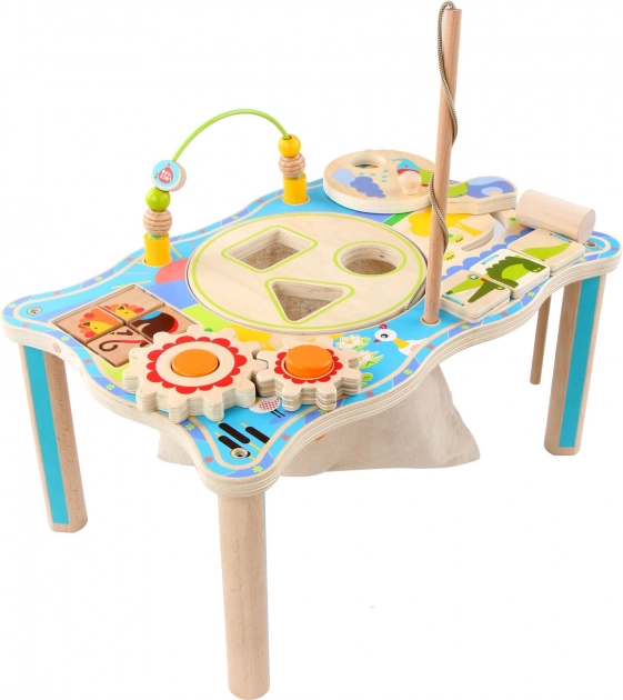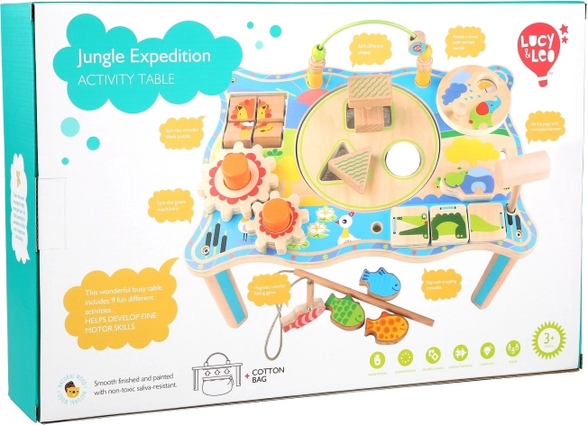 Discover fun and learning in one with the LUCY & LEO – Jungle Expedition kids’ activity table. This quality wooden multifunctional table offers a wide range of activities to develop children’s skills: magnetic fishing, gears, a bead maze, a pounding bench, and a shape sorter. The robust build, playful design, and practical linen bag for collecting pieces ensure hours of meaningful play.
