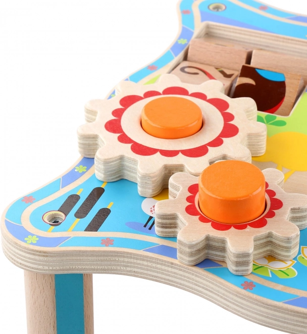 The wooden table with jungle motifs blends fun with learning and supports fine motor skills, hand–eye coordination, and logical thinking. Children can turn the gears, move the beads along the track, train strength and focus with the pounding bench, and practice shape recognition with the shape sorter. In the middle, a linen pouch holds the caught fish and game pieces to keep the play surface tidy.