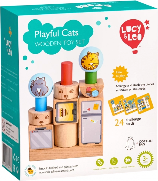 Discover the creative wooden puzzle Playful Cats by Lucy & Leo that develops logical thinking, fine motor skills, and imagination. Children arrange colorful geometric shapes with cat and furniture motifs on pegs following 24 templates. After play, everything stores easily in a linen pouch – an ideal educational toy full of fun and learning.