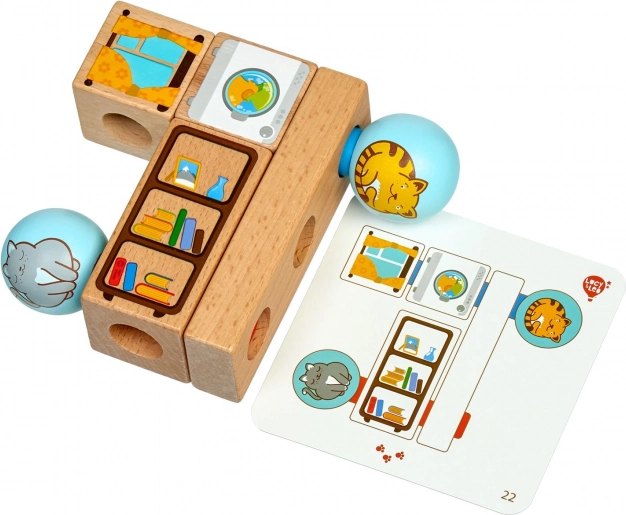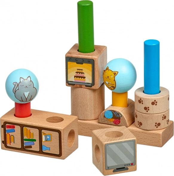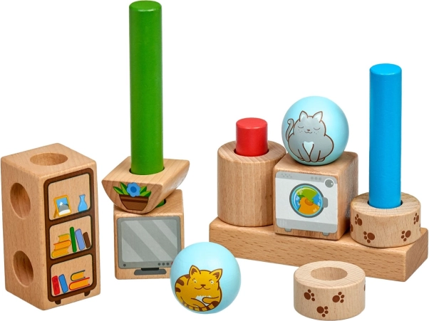 Durable wooden shapes with a smoothly sanded surface and illustrated motifs of cats and household items. Ideal for small children's hands.