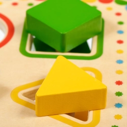 Four color-framed openings on the board match the colors of the pieces. Children easily learn colors and basic geometric shapes.