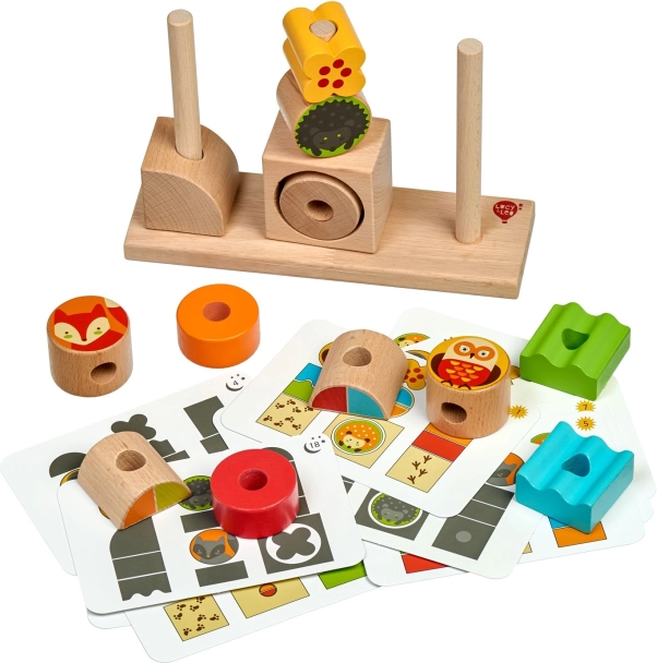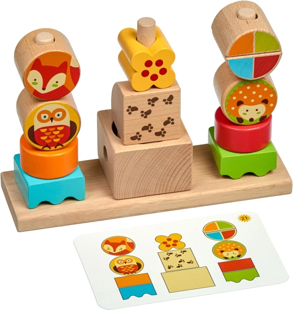 The interactive “Day and Night” puzzle combines fun and learning. Children stack colorful geometric shapes and blocks with animals onto three pegs following the included templates. Day cards highlight colors, night cards emphasize shapes—ideal for gradual practice.