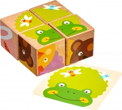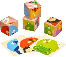 Discover the magic of first puzzles with the LUCY & LEO set – wooden picture blocks with animals and their treats. Children can rotate the four blocks and, using the cards or their own imagination, assemble 6 different themes. In a fun way, they practice fine motor skills, visual recognition, and logical reasoning.