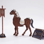Build an impressive warrior horse featuring finely crafted silver armor with metal buckles and movable front limbs. The model is made from quality wood and enhanced with leather elements for an authentic and durable feel. Also included are a totem battle flag and a mobile barrier to inspire creative stories and scenes.