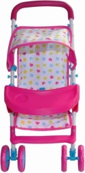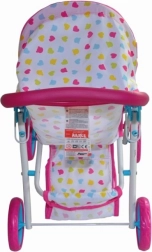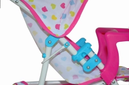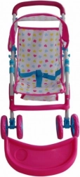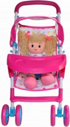 Kate is a stroller for dolls up to 50 cm long. It is equipped with a foldable canopy, a feeding tray, straps, and swiveling front wheels. It also has a basket for doll accessories needed during a walk, including milk bottles, clothes, and diapers.