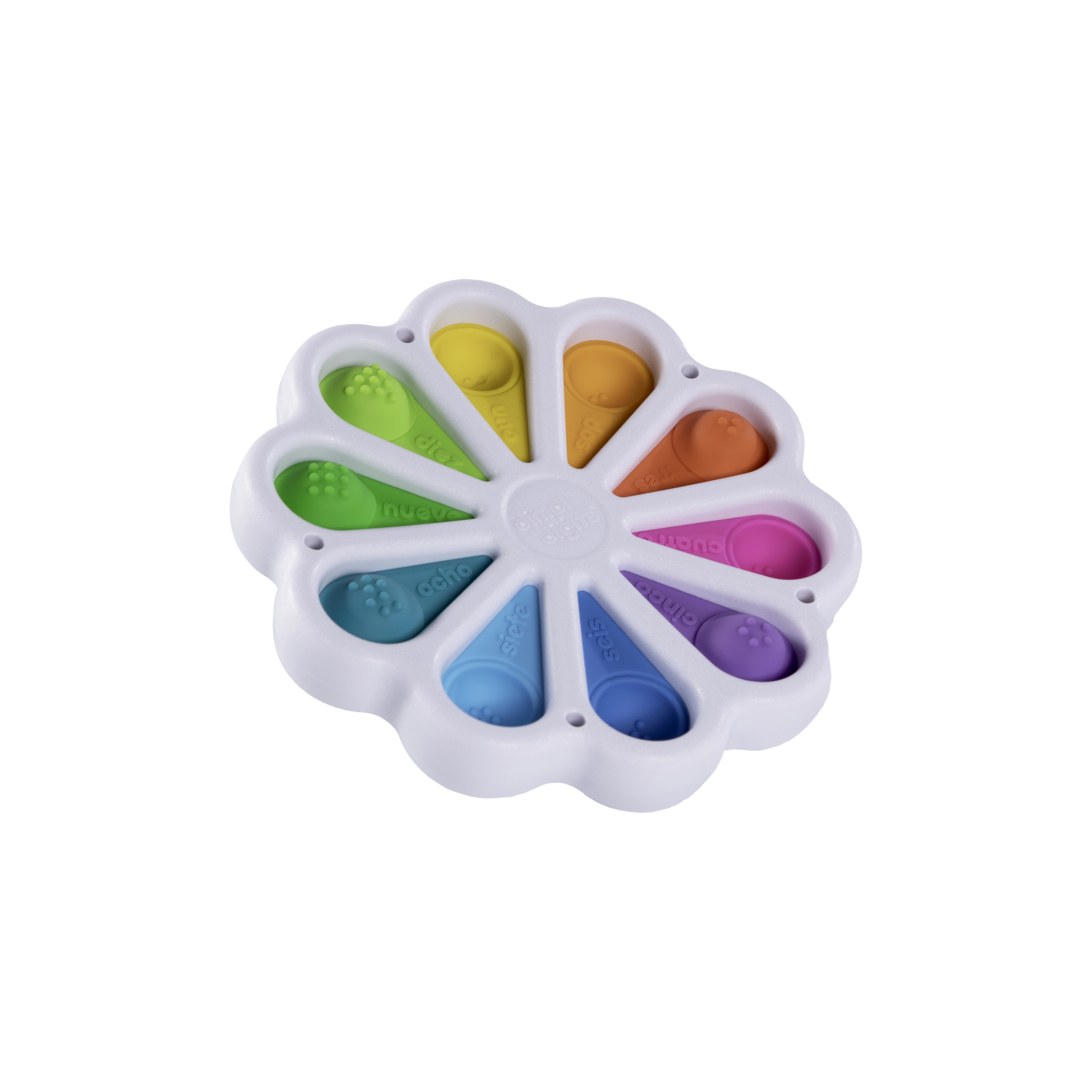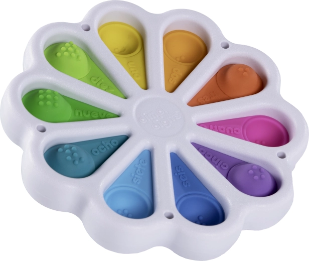 Discover the fun sensory toy Dimpl Digits by FAT BRAIN – flower-shaped popping bubbles with numbers and counting that support fine and gross motor skills, hand–eye coordination, and healthy psychomotor development. Colorful silicone bubbles invite squeezing, color learning, and first numbers. Suitable from birth.