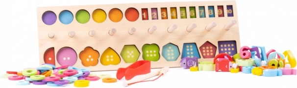 This multifunctional wooden toy is ideal for first steps into the world of counting and shapes. Through play, kids practice color recognition, matching numbers 1–10, threading rings, and catching pieces with a magnetic rod. The set also includes plastic tweezers to increase difficulty and train grip strength.
