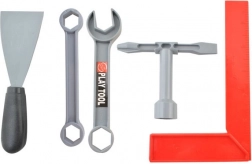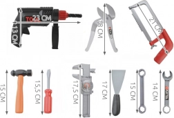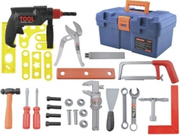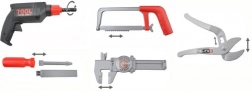 A complete children's tool set in a sturdy carry case for little DIYers aged 3+. Includes realistic plastic tools such as a drill with a rotating bit, a saw, a hammer, screwdrivers, pliers, a set of wrenches, a caliper, and more accessories. The set develops fine motor skills, creativity, and teaches responsibility through play. The case keeps everything neatly organized at home and on the go.