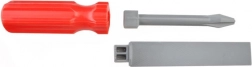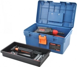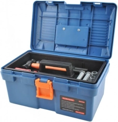 carry case, hand drill, hammer, Phillips screwdriver, flat screwdriver, screws and nuts, hand saw, adjustable wrench, ring spanner, socket wrench, open-end wrench, caliper, spatula, file (interchangeable attachment), spirit level, squares, connector pieces with holes