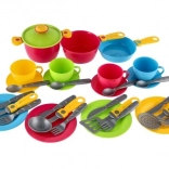 This colorful dish set for a children's play kitchen is ideal for pretend cooking, serving, and shared “tea parties.” Sturdy plastic and rounded shapes are child-friendly, and the bright colors encourage imagination and cooperation.