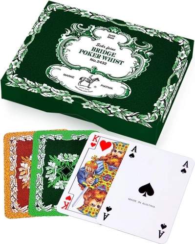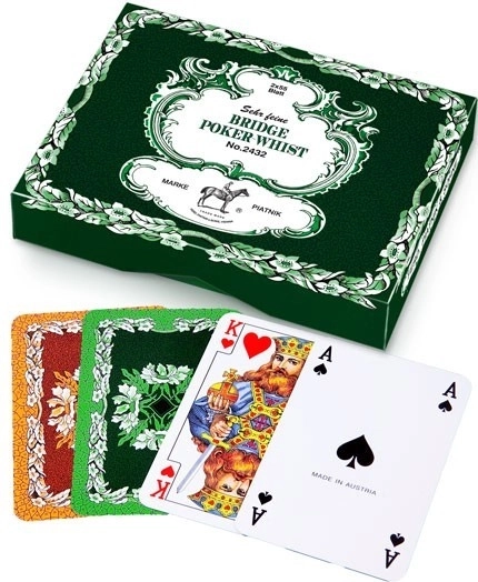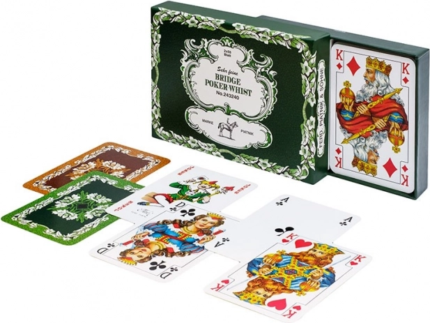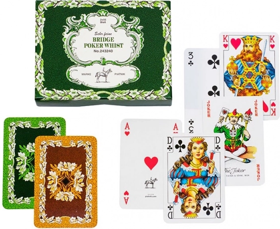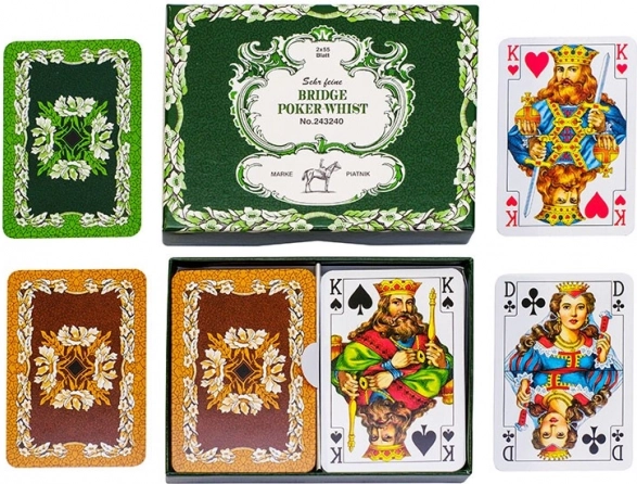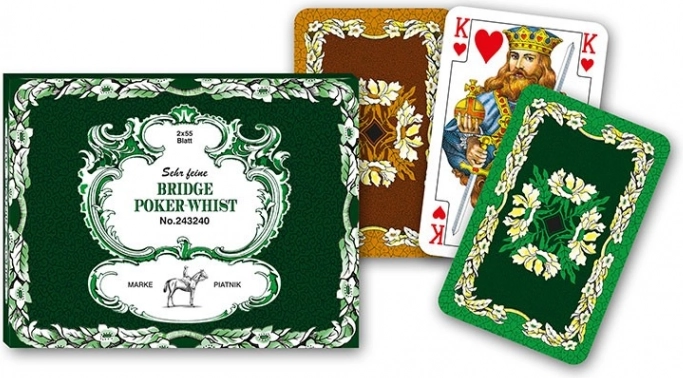 Classic Piatnik playing cards with an oak leaf motif in a practical double pack will delight fans of bridge, poker, and rummy. Each deck offers 55 laminated cards measuring 58 × 89 mm with a weight of 310 g/m², featuring durability, a comfortable grip, and an elegant design rooted in pre-war tradition.