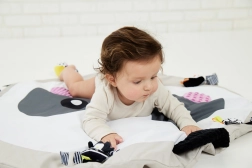 • Development support: high-contrast patterns for vision, textures and crinkle sounds for touch and hearing.