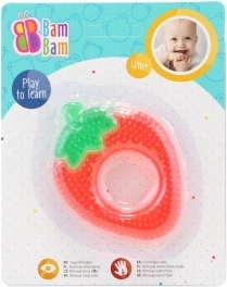 Cheerful colorful teether with cooling gel inside - strawberry. Packed on a cardboard card. Package dimensions 17 x 13.5 cm. Teether size 10 cm. Age 4m+