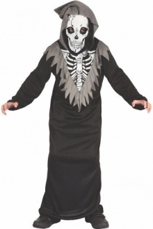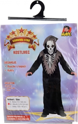Kids’ carnival skeleton costume 120–130 cm. Hooded robe and balaclava, ideal for carnivals, Halloween, and school parties. Comfortable and easy to put on.
