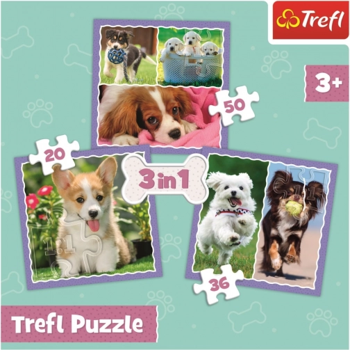 Trefl kids' 3-in-1 puzzles with cute puppies. Three separate images 200 × 195 mm, different piece counts, eco-friendly materials. Suitable from 3 years.