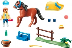 The set includes a child figure, pony with blanket and bridle, riding hat, bucket, bag, brush, and additional accessories. The parts are easy to clean, durable, and safe for children.
