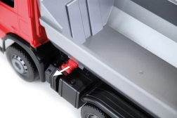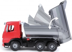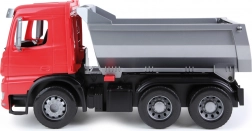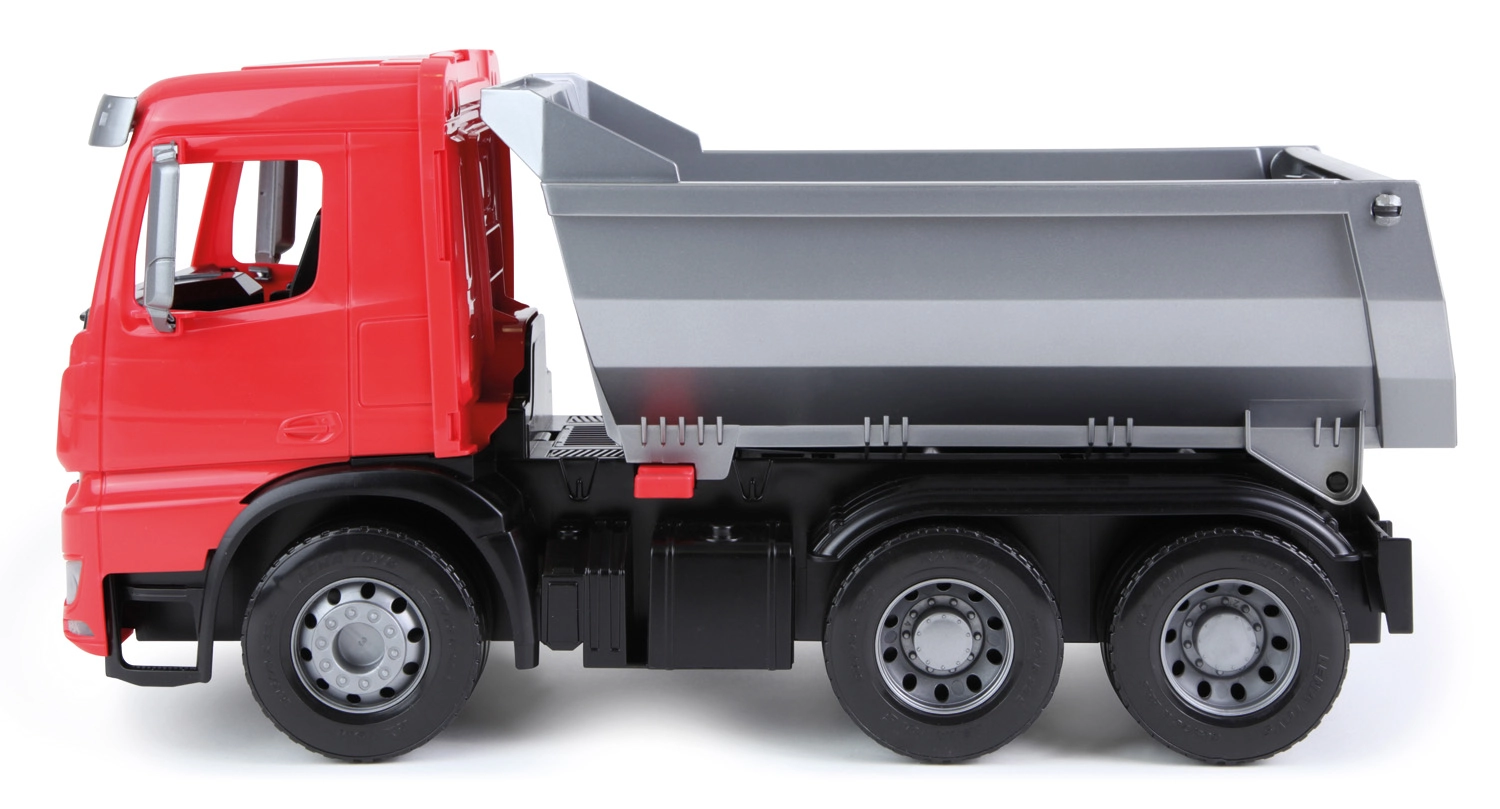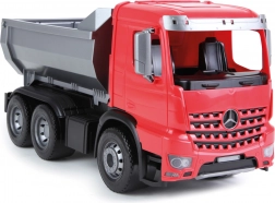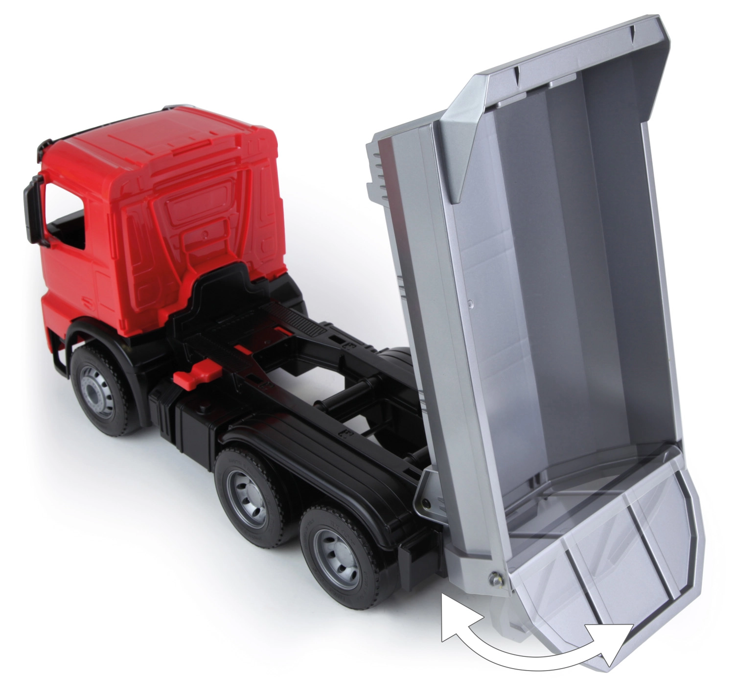 A realistic model of the LENA MERCEDES AROCS tipper truck with a length of 45 cm, featuring a robust build, 6 mm galvanized steel axles, and a tilting, lockable dump bed. Ideal for indoor and outdoor play, safe for children aged 3+, and TÜV certified.
