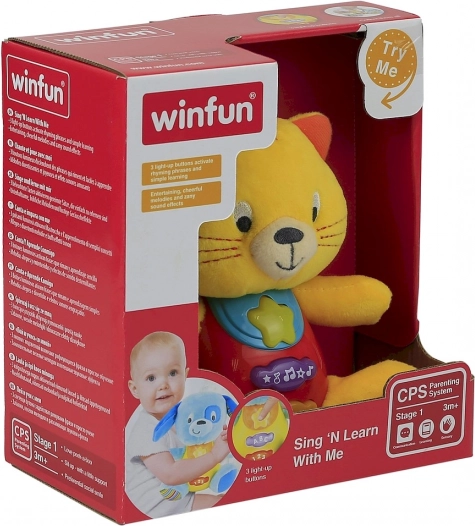 The interactive plush kitten delights babies and toddlers with vibrant colors, lights, and pleasant sounds. Children will love the three backlit buttons that trigger melodies, sounds, and spoken phrases while introducing the first letters and numbers in a fun way.