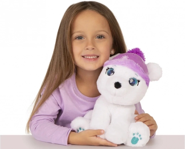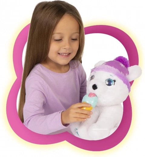 Polus is an interactive polar bear who is very sweet. He is made of soft, pleasant plush and has adorable sparkling crystal eyes. He makes 10 sounds! After he eats the ice cream from the set, he starts to feel unwell and shivers with cold. Take care of him and pet him, and he will feel better right away!