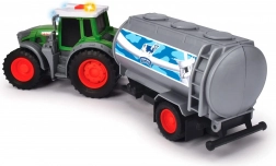 On the farm and in the field, lots of equipment is needed, including a tractor with a large milk trailer. Professional milk transport is guaranteed with the Fendt milk transporter from Dickie Toys! The officially licensed Fendt tractor performs well on the home farm or outdoors, e.g., in the garden. The agricultural vehicle with trailer is a great prompt to talk about the hard work of farmers and to appreciate it; it also stimulates children’s imagination while training the fine motor skills of their small hands. Large, wide tires ensure sufficient grip so the tractor stays on course. The rich play features are enhanced by light and sound effects for more realistic play. Moving parts, such as the folding base of the milk trailer, further support immersive play. Colorful details like themed stickers and a folding stand, as well as a banner on the trailer and the attached ladder, ensure authentic play in the kids’ room. Thanks to the 2 AAA batteries included, you can start playing right out of the box! It offers exceptional fun for children and their caregivers. At the same time, play stimulates motor skills and sparks children’s inventiveness and curiosity about the world around them. Discover the joys of farming and farm work with the agricultural vehicles from the FARM series by the renowned vehicle brand Dickie Toys! The Fendt tractor with milk trailer is a proven gift for birthdays, Christmas, Children’s Day, and other occasions for children aged 3 and up.