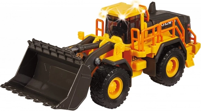 Licensed VOLVO loader without motor with light and sound functions. The cab is made of metal. Soft rubber tires easily handle demanding construction site surfaces. Moving parts: opening rear doors, bucket and cab; thanks to steering control, the vehicle can easily turn right and left. Length: 21 cm.