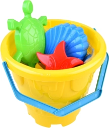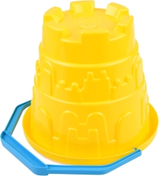 The plastic bucket with a blue handle and molds inside allows for easy transport to the beach or garden.