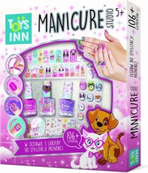 The set includes 3 nail polishes, nail tips, nail stickers, 2 files, a sheet of stickers, and a ring.