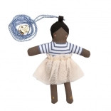 The necklace is made of a wonderfully crafted doll named Ruby and a blue chain with beads. The Ruby doll is made of cotton and has a beautiful peach-colored tulle skirt.