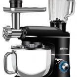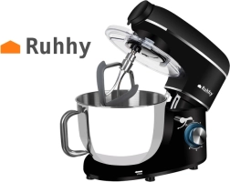 The versatile 3-in-1 RUHHY kitchen machine combines planetary mixing, a 1.5 L glass blender, and a meat grinder in one powerful device with a 2200 W motor. Thanks to the 6.2 L stainless steel bowl with handle, 6 speeds + PULSE, and three professional attachments, you can easily whip, mix, and knead dough, as well as grind meat or make smoothies. It includes a splash guard and rich accessories including a piping bag.