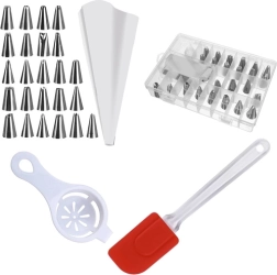 - piping bag + 24 tips in organizer, egg separator, spatula