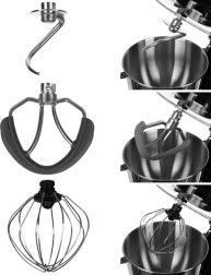 The box includes three attachments: a dough hook, a balloon whisk, and a beater with silicone scrapers for perfectly combining ingredients. A stable base with anti-slip suction feet, a safety lock, and an LED backlit control knob make this machine a reliable partner for baking and everyday cooking.