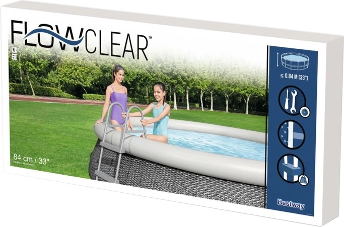 The BESTWAY Flowclear steps for pools up to 84 cm high are designed for maximum safety and comfort. The stable metal frame with anti-corrosion treatment and sturdy plastic treads ensure a sure step every time you enter and exit the water. An ideal solution for garden pools, children, and seniors.