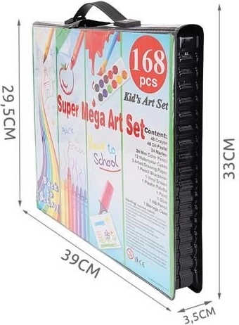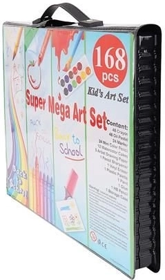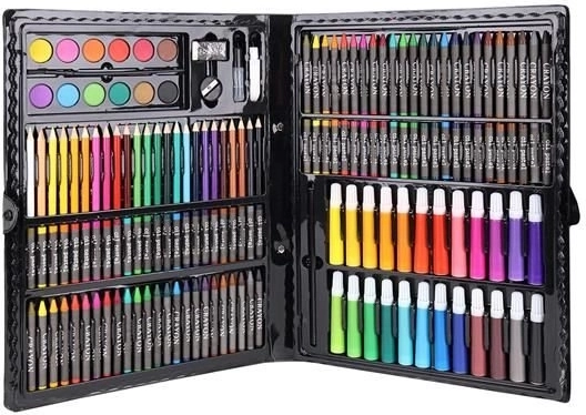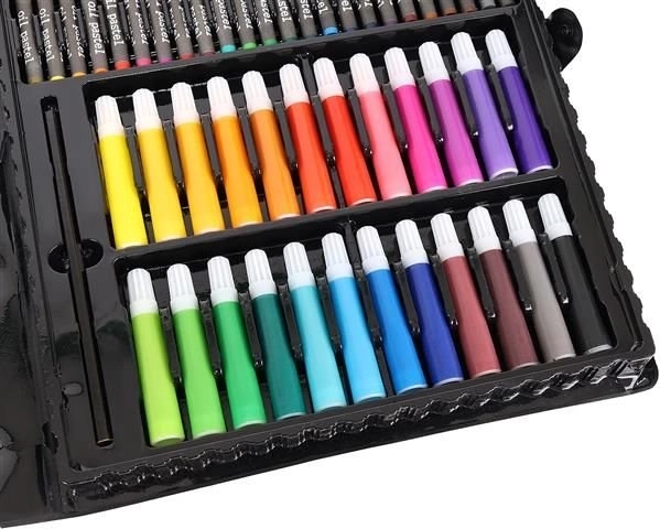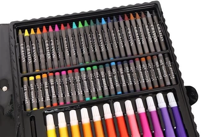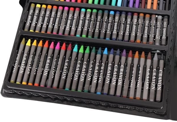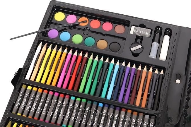 Super Mega Art Supplies Set 168 Pieces offers everything you need for creating artworks: 24 pastel pencils, 24 colored markers, 48 oil pastels, 48 wax crayons, 12 watercolor paints, and much more. All supplies are elegantly arranged in a practical case, ensuring easy access and clarity.