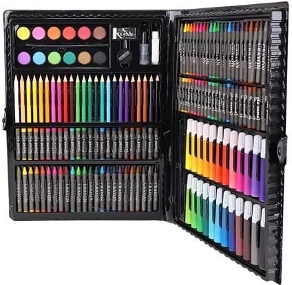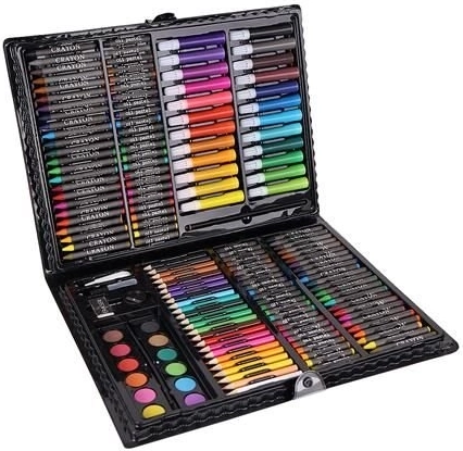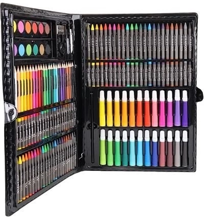 The set includes a wide selection of art supplies, from crayons to watercolor paints, making it perfect for various creative projects.