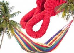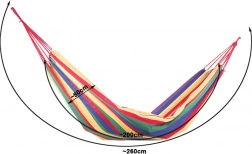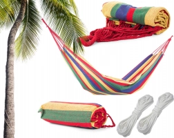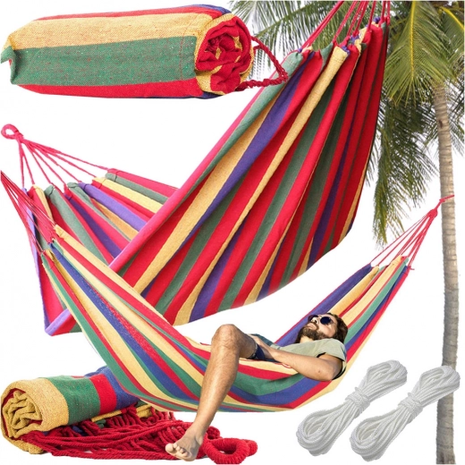 This striped single-person hammock combines durability with maximum comfort. The sturdy cotton fabric with a polyester blend feels pleasant to the touch and breathes well, keeping you comfortable even on warm days. Thanks to the practical case, it’s easy to carry and takes up very little space.