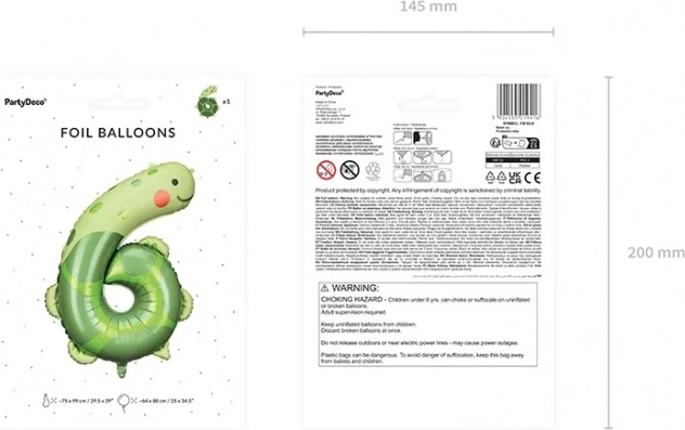 Celebrate a birthday in style with a foil balloon in the shape of the number 6 featuring a turtle design. Ideal for kids’ parties and themed events, it can be filled with air or helium, and the included straw makes inflation easy. Once inflated, it measures approx. 57 × 86 cm and guarantees a standout decoration at any event.
